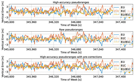 Similar conclusions can be drawn when considering the vertical error, which is studied in Figure 8. In this case, three cases were also analysed: high-accuracy pseudoranges, raw pseudoranges, and measurements with pre-corrections. While the greatest benefits were obtained when using high-accuracy pseudoranges, raw observations provided some benefits compared to the side-band solutions. Also, the results in the position domain confirm that pre-corrections have a limited impact on the reconstruction process and the final position performance.
