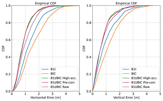 The performance obtained in the position domain is further analysed in Figure 9, which shows the Cumulative Density Functions (CDFs) of the different combinations obtained using the B1I and B1C signals. The left box of the figure considers the horizontal error, whereas the vertical channel is analysed in the right part.