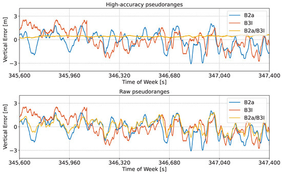 Similar conclusions can be drawn from Figure 14, which shows the time evolution of the vertical error obtained using an SPP solution for the B2a/B3I meta-signal combinations.