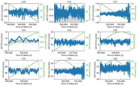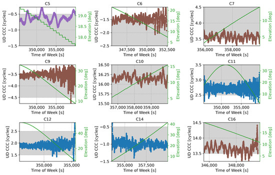 UD code-carrier combinations used for the ambiguity resolution process for the different satellites broadcasting both B1I and B1C signals, expressed in cycle counts. The corresponding satellite elevation is also provided in green.