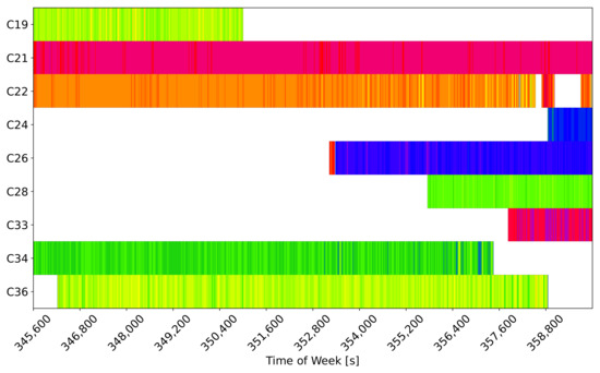 The effect of rounding on the UD code-carrier combinations is studied in Figure 6 for the B1I/B1C case. The figure provides a graphical representation of the integer number of cycles estimated using the rounding operation in (11) for the different satellites. The colour scheme has been selected in order to highlight possible cycle slips due to the noise and bias on the code-carrier combinations.
