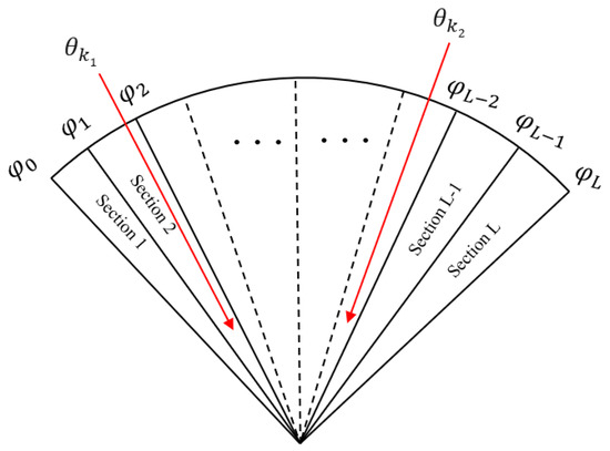 Generally, since the number of measured target signals is limited and sparse in airspace, the target airspace range can be evenly divided into L intervals, as shown in Figure 4. We can obtain . If the target (k = 1, 2, …, K) exists in a sub-interval, the value of the interval section takes the value 1; otherwise, it takes a value of 0. The above concept can be described as the following formula: