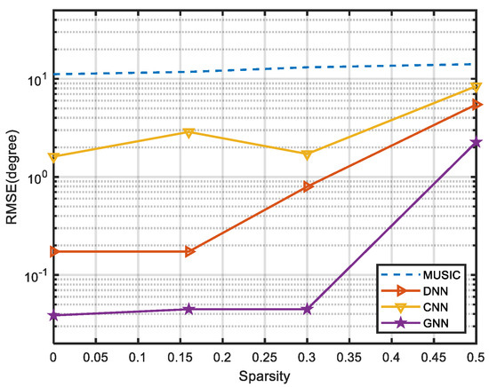 First of all, the RMSE values of different algorithms under different sparsity conditions are tested. As shown in Figure 5, the proposed GNN algorithm has excellent performance, even when the array loses one-third of its elements. Its RMSE remains as low as 0.04°, which is much lower than 13.12° for MUSIC and 0.79° for DNN. Since MLP cannot exchange information between different array elements, under the condition of sparse arrays, a large amount of information can indeed lead to algorithm performance degradation. On the one hand, the CNN uses local perception to extract feature information, and the connection between global features is not tight. On the other hand, the graph convolution module transmits updates layer by layer through the connection relationship between nodes. It effectively captures and models the spatial relationship between sensors. More specifically, the GNN algorithm uses the signals received by the adjacent antennas to update the characteristics of the nodes. It obtains global information through the aggregation and update of each layer. So, the GNN algorithm can build a complex nonlinear mapping relationship even if there are a large number of elements lost.