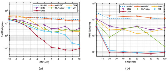 In this experiment, under the conditions of an array sparsity of 1/3, the dependences of different algorithms on different SNR and numbers of snapshots are explored. We compare the GNN algorithm with MUSIC, the improved front-and-back smooth MUSIC (ssMUISC) [13], the neural network-based algorithms DNN and CNN and two excellent neural network generalization models ViT [34] and MLP-Mixer [35]. It is observed in Figure 6a that under the condition of 50 snapshots, all algorithms improved with an increase in SNR, among which the algorithm based on the neural network improved significantly, and the GNN model achieved the best performance above −6 dB. As shown in Figure 6b, under the condition of a signal-to-noise ratio of 10 dB, the number of snapshots is between 20 and 100, and the algorithm is not highly sensitive to its changes. This means that excellent angular performance can be achieved with a small number of snapshots. Even though MUSIC’s performance is poor in low-snapshot conditions, both GNN and ViT guarantee a very low RMSE with similarity. At the same time, the parameter size of the ViT model reproduced in the experiment is 1.18 M, while the proposed GNN model parameter is 690.93 KB, indicating that the GNN algorithm achieves the same high-precision performance as ViT with less computing resources. It is obvious that the proposed GNN model can reduce the computational burden without sacrificing performance and the Graph Conv structure used in the GNN algorithm can well adapt to the angle measurement conditions of sparse arrays with limited snapshots.
