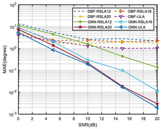 Furthermore, we tested the MAE of the single-snapshot algorithms on different sparsity arrays including RSLA12, RSLA16, RSLA20 and ULA. It can be seen from Figure 8 that when the SNR is higher than 5 dB, the GNN algorithm combined with RSLA16, RSLA20 and ULA achieves better angular measurement performance than the DBF algorithm applied to the ULA. Therefore, the proposed algorithm can adopt fewer antenna array elements occupying the same antenna aperture and obtain a level of performance only achieved by the traditional algorithm applied to the ULA. It also contributes to reducing the manufacturing cost of radar antennas. Especially in practical applications, a sparse array configuration, which can effectively reduce the coupling between physical antennas, has important engineering value.