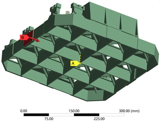 As indicated in Figure 1, the simplified Taiji-1 interferometer model is constrained by the 16 fixed nodes (A) located on the bottom center of the interferometer platform to lessen the effect of the friction, which is far greater than the given force with a magnitude of mN or even μN between the interferometer platform and the optical substrate. In addition, the specific part (B, marked in red) is chosen to be subjected to the given force, because it is one of the six surfaces rigidly connected to the whole satellite. Here, the force is dependent on time and is assumed to be: