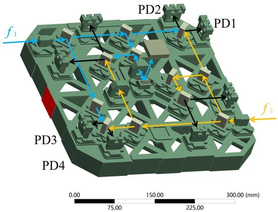 The objective of this section is to experimentally quantify the interferometer result fluctuation generated by the force perturbations. It is difficult to recreate the true in-orbit loading conditions when conducting a ground experiment. Hence, we simplified the model, the loading force, and the loading constraints to set up the transfer function between the force and the optical path signals. The detailed introduction of the Taiji-1 interferometer has been presented in the literature [11], and a brief simulation-related introduction of the interferometer model and optical path layout are given in Figure 1 and Figure 2, respectively.