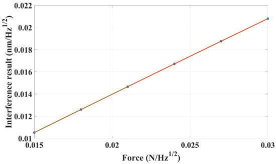 Six different force conditions are simulated, where A is assigned with values of 0.5, 0.6, 0.7, 0.8, 0.9, and 1.0. In each case, the directional deformation of all nodes on the thirteen optical components can be exported and the new node coordinates can be calculated to form a new surface of the components every 0.2 s, i.e., a sampling frequency of 5 Hz. The eight interference signals can be obtained every 0.2 s after the light tracing process with a series of parameter settings, such as the light wavelength, reflective index (1.45) of the components, as well as the coating properties. The corresponding subtraction result between photodetectors 1 and 3 is extracted to display the influence of the micro-force perturbation. To be consistent with the following experimental validation, the sampling numbers in the simulation are 36,000, which corresponds to a duration of 7200 s. Finally, the amplitude spectrum density (ASD) value of the reference results (PD1–PD3) in each case can be obtained at a frequency of 0.5 Hz, corresponding to the different peak-to-peak values of the micro-force perturbation. In this paper, an ASD value of measured signal is selected to the transfer function analysis because it is related with time and helps magnify the weak signal. A scatter diagram and fitting curve are given in Figure 3.