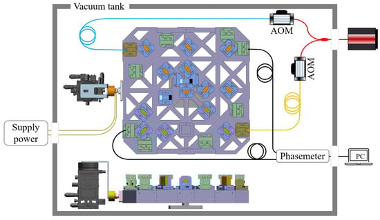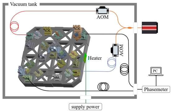The temperature fluctuation is provided by a heater, which is pasted on the surface of the interferometer platform and controlled by the power on/off time of the external power supply for different amplitudes and periods. The impact of noise on interferometric measurement is read out through the optical system shown in the figure, similar to the force disturbance experimental verification system. The laser, identical to the one used in Section 2, is divided into two beams through AOMs. Two laser beams with a 1.6 MHz differential frequency enter the interferometer platform through two collimators each and finally encounter in the photodetector, which converts the interference signal into an analog signal and sends it to the phasemeter (with a phase measurement accuracy better than 0.5 μrad/). In the whole system, the components inside and outside the vacuum tank are connected through the flange.