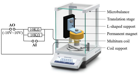 The microbalance method is used in this paper to calibrate the relationship between the electromagnetic force and the voltage of the coil. The diagram sketch of the microbalance method is illustrated in Figure 5 [16]. The circuit diagram on the left is the circuit connection mode of the USB-6289, where the analog output (AO) is used for the voltage value setting and the analog input (AI) is for the voltage value reading. The force application equipment is in a microbalance ME55 by METTLER with a resolution of 10 μg and a typical repeatability of 20 μg. The multiturn coil is located on the base of the microbalance with an unadjusted position. To control the relative position between both, the permanent magnet can realize movement in three translational degrees of freedom through the translation stage, which is fixed inside the microbalance. Moreover, the coil is controlled by the USB-6289 outside the microbalance, and then the electromagnetic force between the coil and the permanent magnet is formed because of the magnetic field generated from the permanent magnet according to the Faraday law of electromagnetic induction. The electromagnetic force can be read from the change in the microbalance mass reading (mass × 9.8 N/kg).