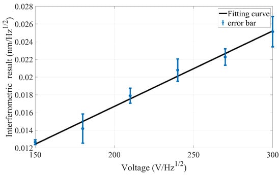To enhance the accuracy of the experimental results, four groups of repeated experiments were carried out for the above different peak-to-peak values. As a result, the average interference result at 0.5 Hz of each voltage peak-to-peak value is given in Figure 6, where the corresponding error bar and the fitting curve are also provided.