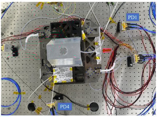 To eliminate the influence of thermal convection and simulate the spatial environment, the experiment was conducted in a vacuum environment. The heat source is located on one of the surfaces on the right side of the interferometer (marked as an arrow), and the temperature sensor is distributed in different locations of the interferometer for more accurate measurement of temperature distribution, all covered with aluminum foil to reduce the direct radiation effect of the heat source. Therefore, analyzing the impact of temperature fluctuation noise on interference measurement during the heat conduction process is the focus. The bottom of the interferometer is suspended through a support frame to reduce the heat conduction between the interferometer and the substrate. To evaluate the stability of the interferometer under the influence of thermal noise, the interference results of two equal arm length optical paths were taken in this analysis, namely the difference between interference results (PD1–PD4). Therefore, the response of the interferometer platform mainly comes from the temperature fluctuations of the heat source, which means that the interferometric measurement results can reflect the thermal drift noise.