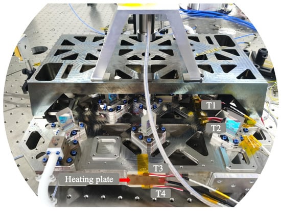 Compared to the loading and unloading of force, the loading and unloading of thermal loads are related to material properties, structural design, and environment, making it difficult to achieve thermal disturbance loading with arbitrary sinusoidal fluctuations. Therefore, it is necessary to design the thermal disturbance load of the heater to ensure that the same thermal load is used in both simulation and experiment. The distribution of the heater and the four temperature sensors is shown in Figure 9.
