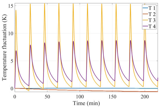 Since the interference measurement resolution is related to the thermal stress stability of the interferometer, it is necessary to maintain the stability of temperature fluctuations as much as possible, that is, to cool down to the room temperature after heating. Therefore, considering the consistency between the experimental verification process and simulation process, the temperature fluctuation is loaded with a period of 22 min (1320 s), including 2 min for heating (with a heat flow power of 7 W) and 20 min for cooling (with a heat flow power of 0), 10 cycles in total. The data output rate is 0.5 Hz and the duration is 13,200 s. A total of 6600 temperature points were sampled and the measured relative temperature fluctuation of sensors after subtracting respective initial temperature is shown in Figure 10. The temperature fluctuations of T3 and T4 show an expected thermal load, while T1 and T2 show a different trend. It can be attributed to the poor contact between sensor and interferometer and the limited accuracy of sensors.