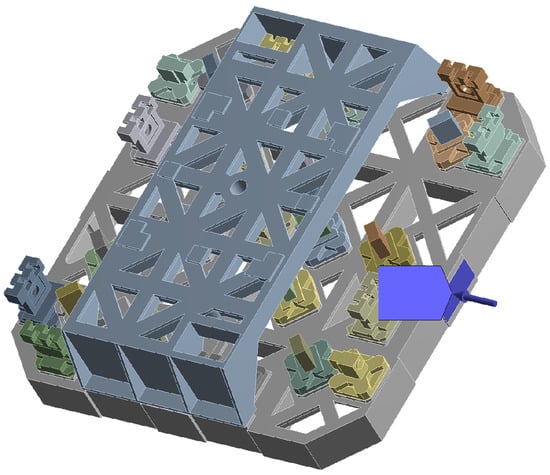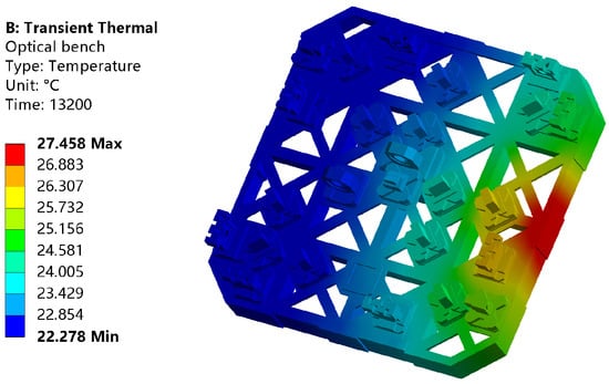 The initial temperature of the analysis process is set at 22 °C. It consists of 660 analysis substeps, which means that a temperature field distribution can be obtained every 20 s and the corresponding sampling frequency is 0.05 Hz. As an example, the temperature field distribution of the entire optical platform at 13,200 s is shown in Figure 12.