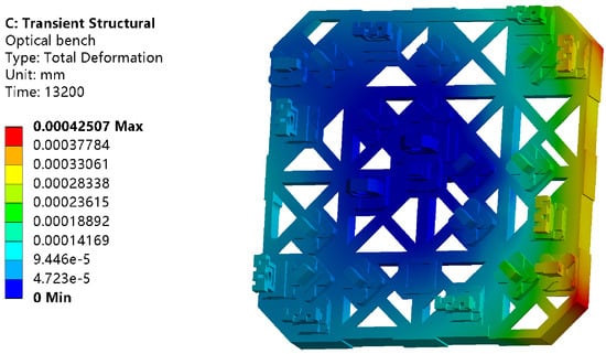 From the above temperature field simulation, it indicates that the temperature distribution of optical components changes over time due to the influence of heat sources. Additionally, there is a fixed constraint of a support frame at the bottom of the optical platform. The optical bench is made of invar steel and the optical components are made of fused silica, i.e., with a different thermal expansion coefficient. Therefore, changes in the temperature field inside the elastic continuous medium can cause thermal stress, which in turn leads to a deformation. Transient structural analysis was used to analyze the deformation results of optical components under different temperature fields. During the temperature field analysis process, the analysis duration is 13,200 s and the analysis number of substeps is 660, with the same sampling frequency of 0.05 Hz. The interferometer is subjected to temperature load only and is fix constrained at 16 points at the center of the bottom. The simulated results show a varied deformation with the change in temperature field. As an example, the total deformation of the entire optical bench at 13,200 s is shown in Figure 13.