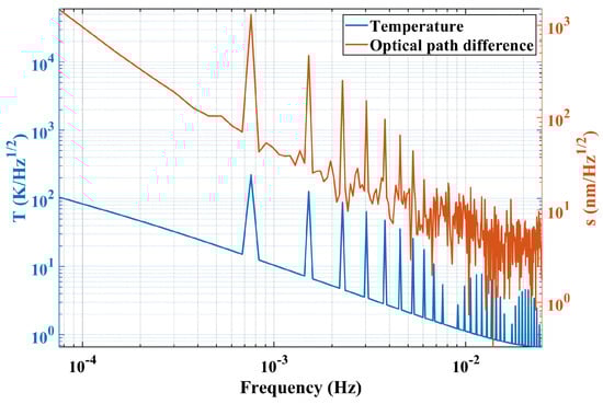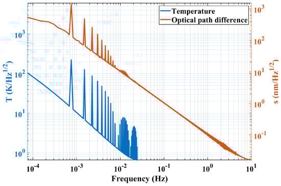 where y represents the time domain result after subtraction, such as the optical path difference result or temperature value, = 0.05 Hz is the sampling frequency, N = 660 is the number of sampling points, and is the Fourier transform. The ASD curve of temperature and optical path noise is shown in Figure 14.