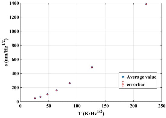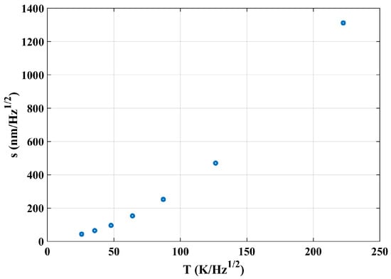 Taking the peak value of both temperature fluctuation and response optical path noise at the same frequencies in Figure 14, a scatter plot of interference optical path noise (s) with temperature fluctuations (T) was obtained and shown in Figure 15.