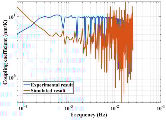 The coupling coefficient curves indicate that it is at the scale of 1 nm/K throughout the measured frequency range. Additionally, the dips/peaks from both curves being not at the same frequencies implies that there are errors in the estimated coefficient from the simulation except for the intrinsic frequency. This indicates that the effectiveness of simulation modeling is related with the accurate judgment of the noise source.