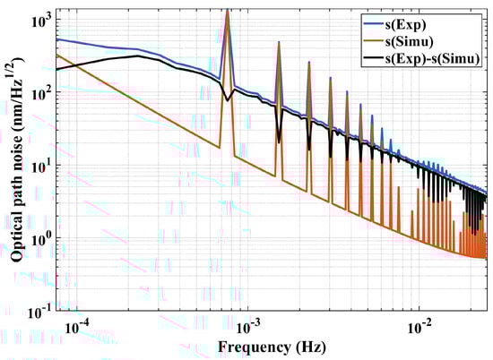 To verify the effectiveness of the transfer function in eliminating thermal noise, thermal noise can be brought into the transfer function, ignoring constant terms, to obtain the interference result s (Simu). Then, it is subtracted from the optical path noise s (Exp) measured in the experiment to obtain the optical path noise s (Exp)–s (Simu) to complete the thermal noise elimination. The optical path noise spectrum curve obtained from the first set of experimental results is shown in Figure 20.