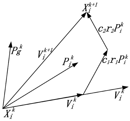 Suppose there are particles in D-dimensional space, with the position of the particle given by and velocity by . The fitness value is calculated by inserting into the objective function to assess the quality of the particle’s position. The optimal position during a single particle’s flight is denoted as , comparing the flight experiences of all particles in the population, and the best group position is determined as , . Each particle updates its velocity and position according to Formulas (5) and (6). The schematic diagram of particle position updates is shown in Figure 2.