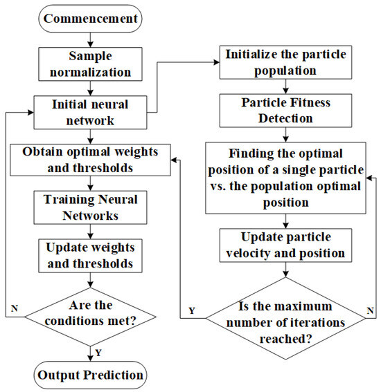 PSO is a straightforward and easy-to-implement method for parameter tuning, primarily focused on searching for the optimal initial weights and thresholds. To address issues such as significant errors and the tendency of traditional BP neural networks to converge to local minima, PSO is employed to optimize BP neural networks. The implementation process of the algorithm is illustrated in Figure 3.