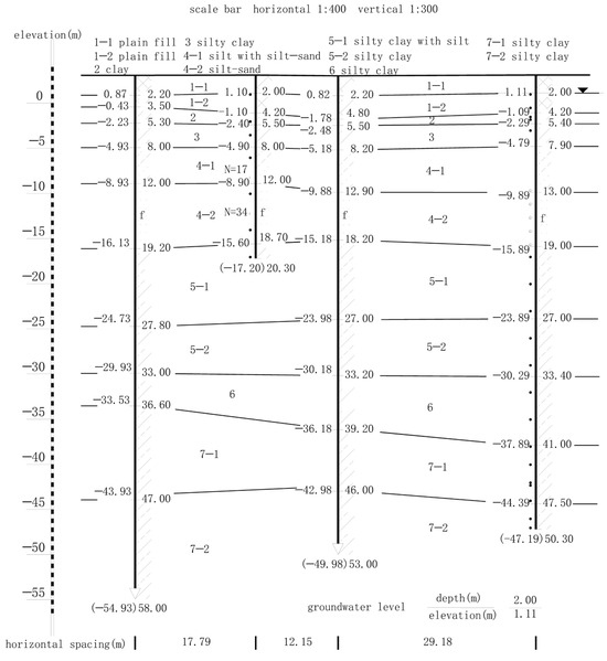 The maximum depth of exploration is 90.75 m below the natural ground surface of the site, and the soils at the shallow depth, except for the soil fill, consist of the Quaternary Holocene to Middle to Late Pleistocene alluvial to lacustrine clastic sediments. The survey report shows that the soil layer around the pit from the top down is 1-1 plain fill, 1-2 plain fill, 3 clay, 4-1 silty clay, 4-2silt with silt-sand. The physical and mechanical parameters of each soil layer are listed in Table 1, and a typical geological profile is shown in Figure 4.