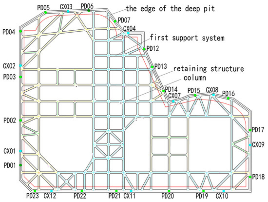 Monitoring focuses on the pit support structure, the bottom and surrounding soil of the pit, surrounding buildings, relevant pipelines and facilities, municipal structures, groundwater conditions, and important surrounding roads. Monitoring continues until the completion of the pit, with a frequency of once per day. This study primarily calculates the vertical displacements of pile tops (PD01–PD23) and the deep horizontal displacements of piles (CX01–CX12) to assess whether the accuracy of numerical simulation predictions improves after parameter inversion. Vertical displacement monitoring employs the leveling method using an electronic level; deep horizontal displacement monitoring of the support structure utilizes inclinometers, with the bottom of the inclinometer casing serving as the reference point for monitoring the deformation of the support structure. The layout of the pit plan and monitoring points is illustrated in Figure 5.