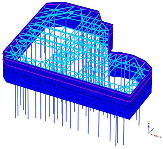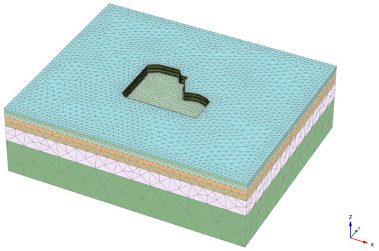 The model constructed using PLAXIS 3D finite element software is depicted in Figure 6, while the support structure is illustrated in Figure 7. A total of 169,360 elements and 257,191 nodes were generated. The model’s computational boundary conditions are based on the excavation of the pit. It is assumed that dewatering is completed during excavation without considering the influence of groundwater.