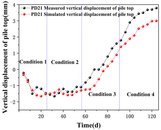 To validate the feasibility of selected support structures and the accuracy of numerical simulation results, initial input parameters were employed to calculate representative displacement values at monitoring points PD21 (vertical displacement of pile top) and CX07 (horizontal displacement along the pile shaft).