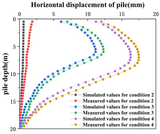Pit excavation to the bottom of the pit, under different working conditions CX07 horizontal displacement of pile simulated values and measured values as shown in Figure 9. When the foundation pit is excavated to the bottom elevation, the simulated and measured values of the horizontal displacement of pile CX07 are presented in Figure 9. A horizontal displacement is taken every 0.5 m from the top of pile CX07 to the bottom of the pile; Figure 9 shows the monitoring value at the end of construction. Field measurements indicate that internal bracing effectively mitigates horizontal displacement along the pile shaft, affirming the adequacy of the support and bracing design. During the excavation to a shallow depth in condition two, the horizontal displacement decreases progressively from the pile top to the bottom. In conditions three and four, the horizontal displacement of the pile increases first and then decreases from top to bottom; as the excavation depth increases, the position of maximum horizontal displacement moves downward. The maximum measured horizontal displacement was 17.51 mm, compared to the simulated maximum of 16.29 mm. Both measured and simulated displacements remained within the warning thresholds, suggesting that the numerical model accurately reflects changes in horizontal displacement along the pile shaft.