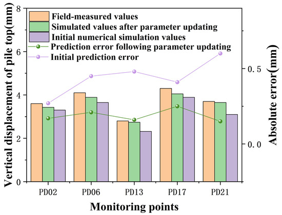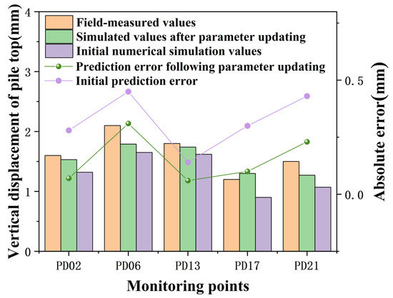 Figure 11 shows that during condition 3, the maximum vertical displacement at the pile top across five measurement points was 2.1 mm, with a minimum of 1.2 mm. The absolute errors between the initial numerical simulation results and the actual measurements were greater than those between the updated parameters’ predictions and the actual measurements, with an average absolute error of 0.4 mm using initial parameters and 0.19 mm after parameter updating.