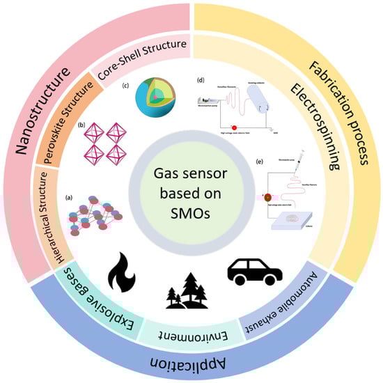 The broad applications and fabrication of SMO gas sensors based on electrospinning: (a) hierarchical structure. (b) Perovskite structure. (c) Core-shell structure. (d,e) Electrospinning. Reprinted with permission from Ref. []. Copyright 2024, Elsevier.