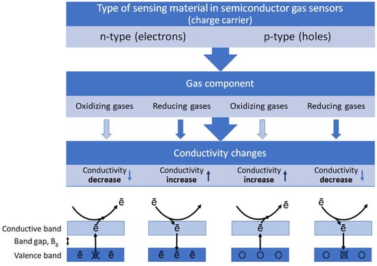 Diagram description of the gas-sensing mechanism and the conduction model based on n-type SMOs and p-type SMOs. Reprinted with permission from Ref. []. Copyright 2023, MDPI.