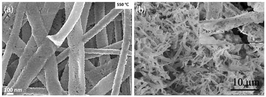 On the other hand, the specific surface area of nanofibers plays an equally pivotal role in dictating the gas-sensing performance []. The more active sites metal oxides have on their surfaces, the higher the response of gas sensors to gases. Moreover, a larger specific surface area can increase the probability of interaction between gases and active sites, thereby enhancing the sensitivity of gas sensors. Kgomo et al. [] fabricated mesoporous belt-like In2O3 products using the electrospinning method and investigated their gas-sensing properties towards methane. The prepared In2O3 consisted of a 1D belt-like structure composed of nanograins with an average diameter of 14–33 nm. The study on gas-sensing properties revealed that In2O3 with nanograins of an average diameter of 14 nm exhibited the highest sensing response for methane. This heightened response is attributed to the mesoporous structure of the belt-like In2O3, comprised of compact and small particles and depicted in Figure 5a. This structure offers numerous active sites for methane gas molecules because of its specific surface area and the high concentration of oxygen vacancies. Consequently, it facilitates enhanced channels for both the adsorption and desorption of methane gas, effectively translating into a substantially improved gas sensor performance. In short, this investigation highlights the significant influence of specific surface area and nanostructure on the gas sensitivity of SMOs, offering an effective way to fabricate gas sensors with high responsiveness.