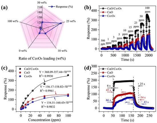 H2S–sensing behavior on CuO, Co3O4, and CuO/Co3O4: (a) responses of CuO/Co3O4 nanocomposites with different mass percentages of Co3O4 for 25 ppm of H2S; (b) responses of sensors for 0.5–100 ppm of H2S at 200 °C; (c) response fitting curves of sensors to different concentrations of H2S at 200 °C; (d) response/recovery time of sensors for 25 ppm of H2S gas at 200 °C. Reprinted with permission from Ref. []. Copyright 2023, Elsevier.