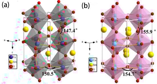 In perovskite structures, some metal elements at the A and B sites can be replaced by other metal ions with similar radii while preserving the original lattice structure []. The resulting composite metal oxides exhibit different physicochemical properties depending on the substituting elements. The stable structure of perovskite materials, and especially the crystal defects and properties formed by the introduction of other substituting elements, have attracted increasing attention from researchers [,]. Due to their catalytic and electrical properties, perovskite materials have found wide applications in gas sensors []. In recent years, many researchers have explored the effects of different ions at the A site or the partial substitution of iron at the A or B sites on crystal structure and gas-sensing performance [,]. Han et al. [] utilized a highly efficient electrospinning method to prepare two samples based on orthorhombic SmFeO3 and SmCoO3 nanofibers. They investigated the influence of various B (B = Fe, Co) site positions on crystal structure and ethylene glycol gas-sensing performance. The corresponding 3D structure models of SmFeO3 and SmCoO3 unit cells are presented in Figure 10. The comparative study revealed that sensors based on SmFeO3 nanofibers (14.3) exhibited a response for 100 ppm of ethylene glycol almost 6.5 times higher than SmCoO3 (2.2). This is mainly attributed to the larger pore size, more oxygen vacancies, more distorted structure, and lower conductivity of SmFeO3. Adsorbed oxygen may more readily bind or dissociate on the surface of the more distorted SmFeO3 structure, ultimately leading to improved gas-sensing performance. Additionally, Queralto et al. [] prepared single-phase interwoven LaFeO3 (LFO) perovskite nanofibers by electrospinning and subsequent annealing processes. Thanks to its high surface area and p-type behavior, the nanofiber network exhibited high chemical selectivity toward reducing toxic gases (SO2, H2S) and could be repeatedly detected at extremely low concentrations (<1 ppm).