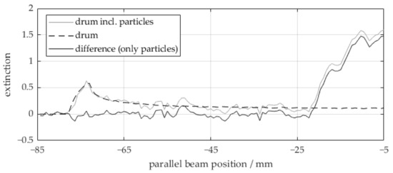 Subtraction of the simulated extinction of the drum wall from the measured extinction of the drum including particles to obtain the extinction of the particles. It is depicted for one half of a parallel beam projection at an arbitrary angular position, wherein the parallel beam position 0 corresponds to the center of the drum (compare Figure 3a).