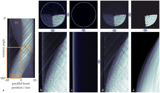 Cross-sectional images of different components of the experimental setup in combination with the part (specified in (a)) of the corresponding parallel beam sinograms that include the glass region, but no polypropylene particles: (b) drum with particles, (c) drum without particles, (d) particles without drum ((d) = (b) – (c)), and (e) segmented glass particles. The arrows indicate the direction of processing.