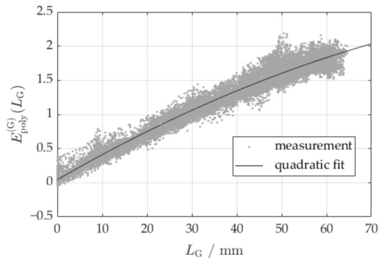 The coefficients and are obtained from the calibration data in Figure 4 by regression using a second order polynomial function. Other nonlinear functions may be chosen as the approximation for for a dense material M other than glass, if this polynomial function does not fit the calibration data.