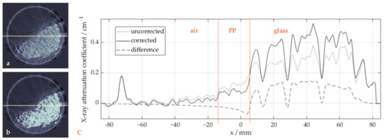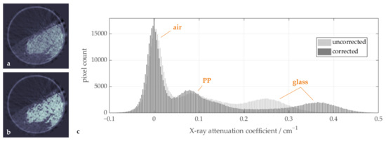 To demonstrate the effect of the correction algorithm within the glass region in more detail, a sample image with high glass content is shown in Figure 6 with (b) and without (a) beam hardening correction, together with a profile of the reconstructed X-ray attenuation coefficients along a horizontal image line (c). Without correction, the X-ray attenuation coefficients in the center of the glass sphere bulk are lower than in the outside regions. This bathtub-shaped curve is a typical effect of beam hardening in homogeneous regions of high absorbing materials, as the underestimation of the extinction increases with material length and is therefore more pronounced in the center region. Note that the profiles include gaps and polypropylene particles, which should be ignored when assessing the shape of the profiles. After the correction, the profile is flattened, and the difference between both profiles clearly shows the described, in this case inverse bathtub, shape.