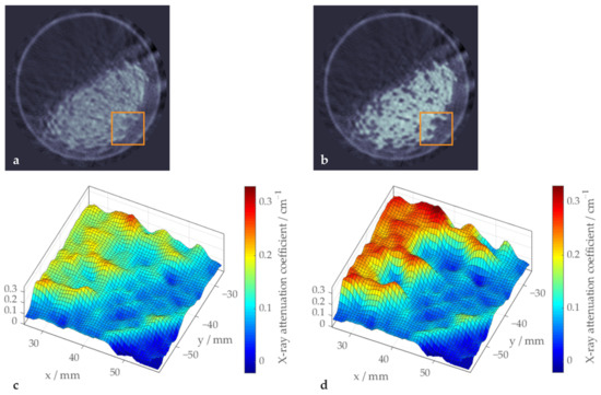 Sample image illustrating the improved homogeneity of the polypropylene region achieved with beam hardening correction (b,d) compared to the uncorrected image (a,c). The orange squares in (a,c) indicate the sections shown in (c,d).
