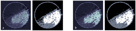 Finally, Figure 9 shows how the beam hardening correction affects the segmentation of the polypropylene particle region from the gas region. The gray value threshold for the segmentation of the uncorrected as well as the corrected image was chosen according to the respective minimum between the air peak and the polypropylene peak in the attenuation coefficient histograms in Figure 5c. In the uncorrected image, the polypropylene region contains inhomogeneities, which are not quite obvious in the gray value images but lead to large differences in void fraction distribution in the segmented image. With beam hardening correction, the differences in the local mean attenuation coefficient for polypropylene are smaller, and thus the resulting void fraction is more homogenous. Thus, the value and applicability of this simplified beam hardening correction algorithm could be successfully demonstrated.