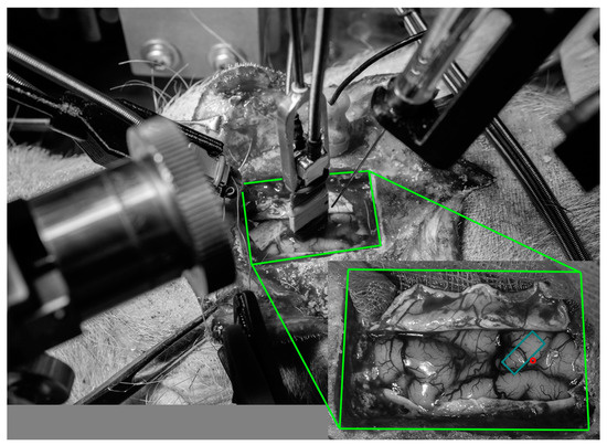 Example of stereotaxic setup following craniectomy and durotomy with the microelectrode array inserted in the forelimb representation of the primary somatosensory cortex (S1) and the Hamilton syringe suspended above the injection site. The cutout shows brain anatomy prior to electrode insertion with the approximate location of the electrode marked by the cyan rectangle (drawn to scale; 3 × 7 mm) and the approximate location of ET-1 injection marked by the red circle. The anterior aspect of the S1 follows the prefrontal gyrus on its lateral and posterior sides and then turns towards the midline.