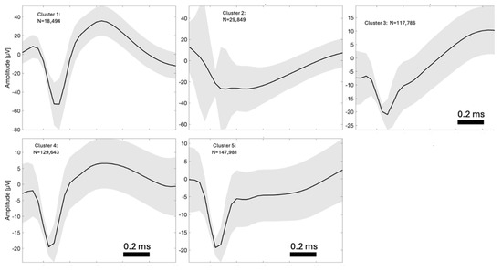 Principle Component Analysis (PCA) was performed on the extracted spikes, after which, k-means clustering was applied to the PCA score array with five clusters (see example in Figure 2).