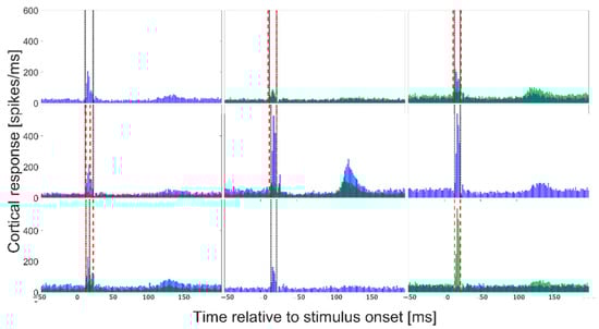 In this way, spikes belonging to clusters that did not display a physiological response as well as spikes not belonging to clusters (i.e., presumed noise spikes) were removed from the analysis (Figure 3). For example, some channels displayed a late response, occurring more than 100 ms after stimulation onset (most notably channel 5, cluster 1, in Figure 3). However, only the first response was included in the analysis of this study and the response window was defined narrowly around this response. Also, some channels would not produce any spikes for clusters 2–5 (as seen for channels 1, 6, and 8 in Figure 3) and were therefore excluded from the analysis. In other cases, a channel cluster was excluded because no significant peak beyond the noise level was seen, as illustrated by channel 9, cluster 1 in Figure 3.