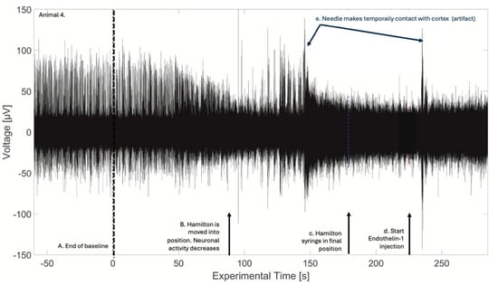 The ET-1 application was observed during the experiments and raw signal inspection to affect the cortical signals surprisingly quickly. Figure 6 shows an example from animal 4, where the neuronal spikes seem to disappear from the recording around 90 s after the ‘end of baseline’ (black stippled line) and before the piston of the Hamilton syringe had been pushed (red stippled line). Here, the ‘end of baseline’ denotes the last time that there is known to have been no perturbation of the animal, marked as a note entry in the recording file. After this time point, the lights would be turned on in the surgery room, the experimenter would physically move to the side of the pig, and the tip of the Hamilton syringe needle would be lowered until in contact with the S1 before finally initiating ET-1 injection by pushing the piston of the Hamilton syringe at the time marked by the red stippled line. We observed that a drop would always gather at the end of the needle prior to ET-1 administration. Based on the timing of the loss in the spiking activity seen in Figure 6, it appears that this drop of ET-1 became dissolved in cerebrospinal fluid (CBF) and inhibited neuronal activity promptly upon contact between the needle and CBF, i.e., before pushing the Hamilton syringe piston. We believe that the large spikes seen between 100 and 150 s in animal 6 are artifacts caused by the movement of, e.g., the Hamilton syringe, and the large spikes after the red stippled line (around 235 s) are an artifact from removing the Hamilton syringe after completing ET-1 application. Due to this observation, we chose to use the ”end of baseline” timestamp as time zero for the analysis.