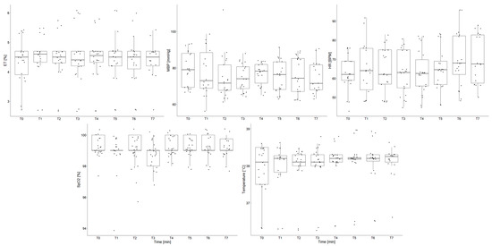 The development over time in the mean value and distribution of the ET, mBP, HR, SpO2, and T is illustrated by the box plots in Figure 7, where each box represents 30 min in the experimental timeline. The variations in the mean value of the ET, mBP, HR, SpO2, and T across the experiment are low compared to the variability within each 30-min segment. The Kruskal–Wallis rank sum test did not reveal any significant differences as an effect of the experimental time for the ET (p = 0.997), mBP (p = 0.573), HR (p = 0.474), SpO2 (p = 0.887), T (p = 0.970), FIR, and PIR (p = 1) or SC (p = 0.138).