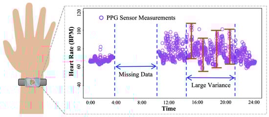 - I.: Large variations from Polar H10 HR measurements. The Polar H10 HR measurements are selected as the HR measurements ground truth because of its use of ECG to allow accurate elimination of artifacts, which offers high precision and accuracy. As shown in Figure 8a,b, the Polar H10 HR measurements, i.e., test data (red dots), provide more precise and accurate HR measurements than raw Garmin HR measurements (purple dots). However, as shown in Figure 8c, subject #3’s Polar H10 HR measurements have much higher variations than the Garmin HR measurements. Such abnormal Polar H10 HR measurements can be caused by the sensor displacement or malfunction, which needs to be further investigated.