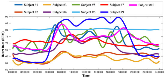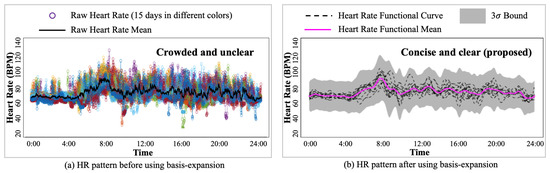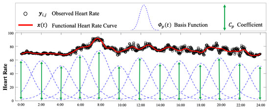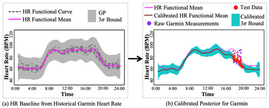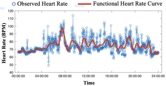 - II.: Large HR magnitude discrepancy between Polar H10 HR measurements and Garmin HR measurements. The proposed method was developed to mitigate the impact of missing values and large variations from the wearable devices. As shown in Figure 8a,b, the calibrated HR functional mean provides a complete and precise HR estimation by the proposed method. However, as shown in Figure 8c, most of the raw Garmin HR measurements are much lower than the test data, i.e., Polar H10 HR measurements, leading to an underestimation of HR by the proposed method. The large HR magnitude discrepancy between Polar H10 HR measurements and Garmin HR measurements may be caused by the sensor inaccuracy or malfunction, which cannot be solved by the proposed method.
